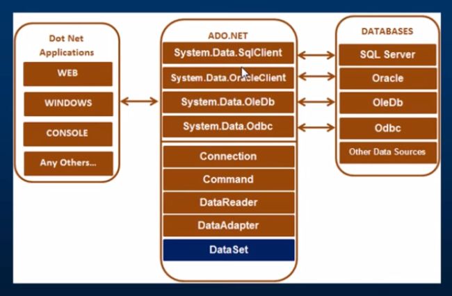 In this diagram, we can see that there are various types of applications (Web Application, Console Application, Windows Application and so on) that use ADO.NET to connect to databases (SQL Server, Oracle, OleDb, ODBC, XML files and so on).